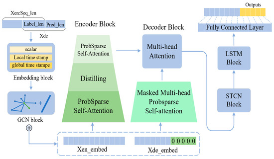 This paper addresses the issue of supply volume forecasting by first constructing a multidimensional feature engineering framework aimed at extracting key features from various dimensions to enhance the expressiveness of label data. This involves capturing features related to spatiotemporal evolution characteristics, freight rates, and demand volume, thereby comprehensively revealing the intrinsic properties of the data and improving the model’s interpretability of the label data. Next, an embedding layer is introduced to facilitate effective encoding of data features, providing rich input information for subsequent model learning. Additionally, the STCN module is designed to further extract the spatiotemporal features of the supply volume data, considering dynamic information across time and space. Finally, an LSTM model is incorporated to capture both short-term and long-term dependencies in the supply volume, enhancing the model’s ability to grasp long-range dependencies. The prediction values are subsequently obtained through a multilayer perceptron. Overall, the structure of the improved Informer model is illustrated in Figure 5.