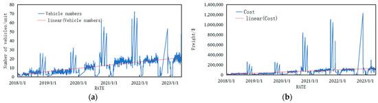 The supply volume, like the demand volume, exhibits temporal characteristics, with freight rates serving as a key influencing factor for changes in supply volume. The temporal evolution of supply volume and freight rates is illustrated in Figure 6, which shows the evolution of supply and freight rates, with (a) a chart of time series changes in supply and (b) a chart of changes in the chronology of freight costs, where the dashed line represents the trend line. Overall, the supply volume shows an upward trend over time, with a recurring spiral seasonality. In contrast, freight rates remain relatively stable over time, exhibiting a slight upward trend punctuated by sharp fluctuations on specific days each year. These fluctuations are closely related to factors such as transportation industry dynamics and unforeseen social events.