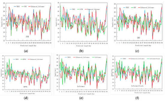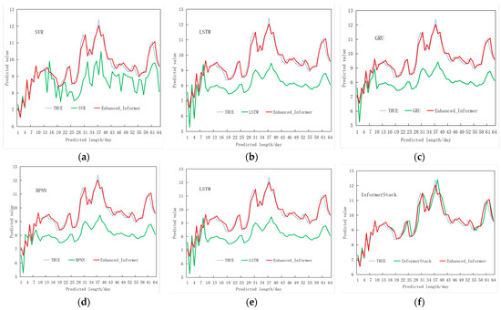 To further validate and visually demonstrate the predictive performance of the proposed method for supply volume, a visualization of the fitting results from the comparative experiments on the test set is presented. The results of the ensemble model comparisons are shown in Figure 10. The supply volume predicted by the Enhanced_Informer model exhibits a smaller discrepancy from the true values compared to the ensemble prediction models, indicating a greater ability to capture the local signal fluctuations of the true values and demonstrating improved model fit quality.