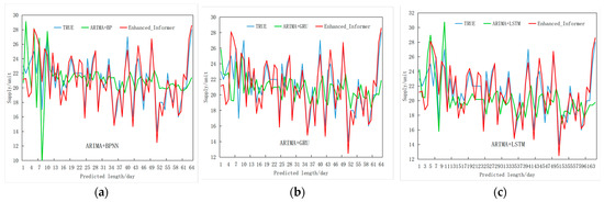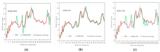 Experimental results of integrated model comparison (ETTH1). (a) ARIMA + BPNN model; (b) ARIMA + GRU model; and (c) ARIMA + LSTM model.