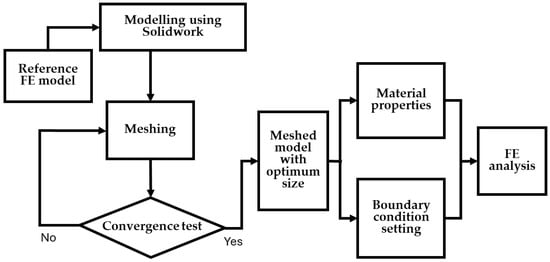 The workflow of the present method is shown in Figure 1. A three-dimensional (3D) model of the ankle was developed based on the reference model obtained from the Turbosquid database. The model represents a foot of a male subject with an age of 23 years, body weight of 60 kg, and foot length of 245 cm. The 3D model was created using Solidworks 2018 and meshed using ANSYS version 19.2. A convergence test was performed to determine the optimum element size. The meshed model was then put through the common FE analysis process.