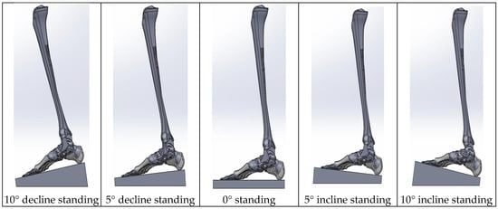 Next, the ligaments were included in the model. A simple structure was created and attached to all the important locations to simulate the ligaments. A model that included ligaments (yellow) was created, as shown in Figure 3b. After the model was created, this model was simulated to stand on the level surface. For various inclined and declined surfaces, the plate angle was changed to simulate the slope surface standing. Figure 4 shows the different models in the various inclined surfaces created according to the literature [13]. The knee was assumed to adopt the effect of incline/decline surfaces to maintain the orientation of tibia perpendicular to the foot.