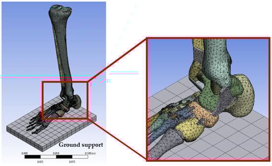 Meshing is a part of the engineering simulation process where complex geometries are divided into elements. Good meshing is required in critical areas such as areas of interest in stress distribution (ankle joint) to increase the accuracy of simulation results. Before meshing was performed, the model was exported in a STEP file and opened in ANSYS. The finite element model was meshed with the ten-nodes 3D-tetrahedral element for bone, cartilage, ligament, and ground support. The ligaments were modelled as a solid element to observe the stress distribution on it. Although most of the previous studies used a tension-only truss to model the ligaments [8,11], there are also previous studies that used isotropic solid element, as mentioned by [14]. Two elements were set on the thickness of each ligament. The model was performed under linear static analysis. Figure 5 shows the complete meshing of the ankle joint model, and the magnified view of the ankle joint.