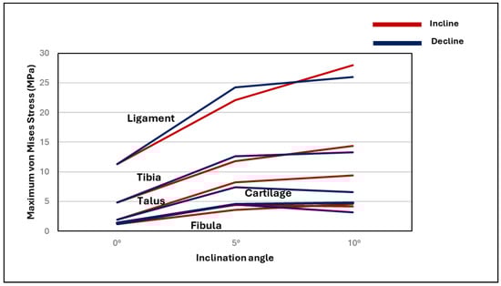 Based on the result, it was reported that the ligament experienced an obvious increment of von Mises stress from 24.2 MPa on 5° to 26.0 MPa on 10° inclination compared to 11.3 MPa on flat standing during decline standing. In addition, the highest von Mises stress was found during standing on 10° inclination—28 MPa compared to 22.1 MPa on 5° inclination and 11.3 MPa on flat standing. Overall, the results show that the maximum von Mises stress at the ankle joint is higher during incline and decline standing compared to flat standing for all components of the ankle.
