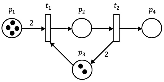 An ordinary PN, or simply PN, is a bipartite graph consisting of two sets of nodes: , and transitions , such that . These nodes are connected by a set of directed arcs . Places may represent activities or conditions in systems modeling, whereas transitions represent the occurrence of a condition or the execution of an activity [53]. Figure 1 shows a typical example of a PN model, where circles represent places and rectangles represent transitions, respectively. Each arc carries a number or arc weight, defined by the function , which helps simulate the system’s dynamics. Moreover, a particular state of the system is represented by a distribution of tokens (black dots) within the places, resulting in the marking of the PN. Formally, a marking is defined by the function . A marked place means that the corresponding activity or condition is being executed.
