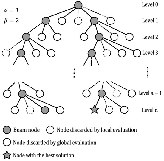 The beam search algorithm was first used as an artificial intelligence technique for speech recognition. It has since been applied to combinatorial optimization problems, such as scheduling problems [55], the traveling salesman problem [56,57,58], and cutting and packing problems [59,60,61,62,63]. This method is efficient because solutions to these problems can be constructed sequentially by appending the next operation, city, or item to the partial solution based on the cost it adds. Thus, the construction of the solution can be viewed as a decision tree. At each level, the corresponding nodes represent partial solutions with given costs, while at the last level, the nodes represent complete solutions. One of these complete solutions is then selected as the best or optimal solution. The beam search algorithm performs a breadth-first search followed by a depth-first search. At each level of the tree, the nodes are branched, and those that are not promising for further branching based on a cost function evaluation are pruned. The number of nodes that are branched at each level are the beams. Once these nodes have been selected, the others are discarded permanently. Since the beam search has no backtracking, it is possible to discard good solutions, but it saves much computational effort. In [64], a modification to the beam search was introduced known as the filtered beam search algorithm. As the name suggests, at each level a local evaluation is carried out over the nodes that share the same parent node. Only those nodes that satisfy a local evaluation condition are considered beam nodes, thereby filtering the nodes. Once all the filtered nodes have been obtained from the parent nodes, only those that satisfy a global evaluation condition become the new beam nodes or parent nodes for the next level.