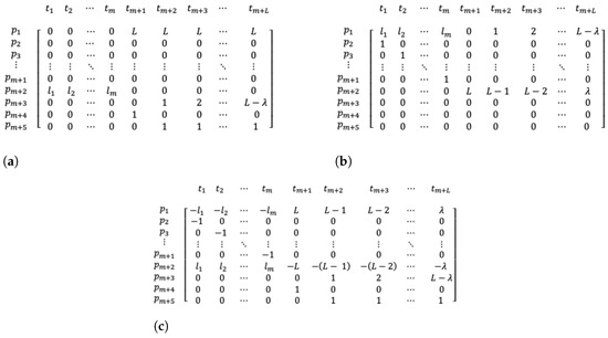 General form of the incidence matrices: (a) input incidence matrix, . (b) output incidence matrix, . (c) incidence matrix, I.
