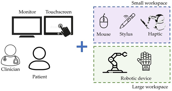 Different sensors and technologies have been used to measure motor coordination, allowing the capture of different parameters related to motor performance (position, velocity, pressure, etc.). This highlights the importance of making multiple devices available to clinicians to extract as many parameters as possible during evaluation. Thus, multimodality can enhance the effectiveness of serious games through multimodal sensory integration (devices to capture human factors) [26]. Traditional input/output devices include the mouse, keyboard, and touchpad. There are also advanced devices such as eye trackers, hand trackers, haptics, motion trackers, gesture controllers, and EEG and EMG devices to name a few [27]. Proper multimodal integration in serious games is still challenging in neurological rehabilitation since a one-size-fits-all system cannot address all patients’ needs.