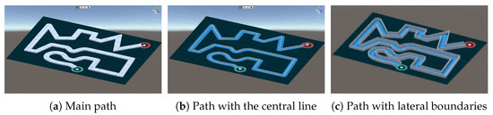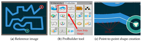 The path creation process is described as follows. Firstly, an image of the path is imported into the background scene as a template for the layout (Figure 2a). Then, an editable object is created using the ProBuilder tool by indicating specific points on the template and using the “New Poly Shape” function (Figure 2b). This function creates a virtual plane-shaped object from the union of points (Figure 2c). From the Inspector panel, an extrusion operation can be applied to the plane-shaped figure to generate a 3D object.
