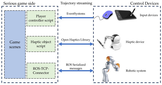 In the case of the haptic device, the Phantom Omni device calculates and sends the position and rotation of the end-effector to Unity using the OpenHaptics v3.5 library [45]. This plugin allows one to control the position of a sphere in the Unity scene and, according to the design restrictions, to provide a realistic haptic experience when drawing. This sphere contains a HapticObject component that is attached to the ball in the game.