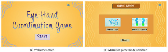 The game is made up of several scenes; however, there are two main virtual environments: the first one focuses on the evaluation, and the second one focuses on the improvement of eye–hand coordination. Both environments are integrated into a module in which the physiotherapist, or the patient at home, follows instructions through scenes to initialise the video game. The first scene is a welcome environment with the game name (Figure 5a). The second scene is an interface that presents the two modes available in the application (Figure 5b).