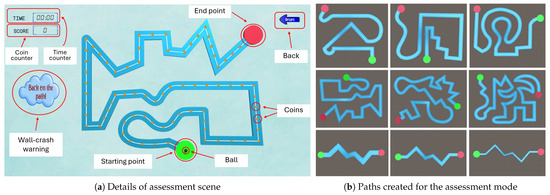 Figure 6a presents the virtual scene for a path. The red circle indicates the point from which the ball begins to move. The red circle is the target point. In the middle of the path, there is a white line that indicates the “ideal” trajectory (equal distance from the side walls). When the ball collides with the side walls, a prompt message (cloud-like) appears to notify the user to correct the trajectory. Additionally, several “coins” are distributed along the ideal trajectory. Each reached coin gives a point. Finally, the game time and score are displayed in a panel in the upper-left corner. The scores are determined by the coins gathered by the user.
