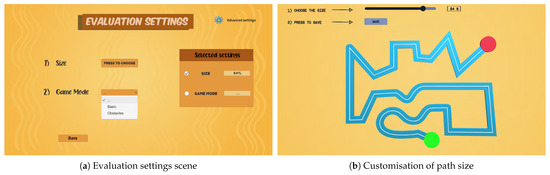 In addition to the different path designs, the assessment scene allows configuring each path according to the patient’s characteristics. Figure 7 presents the settings screens for the evaluation mode. The main options are as follows: