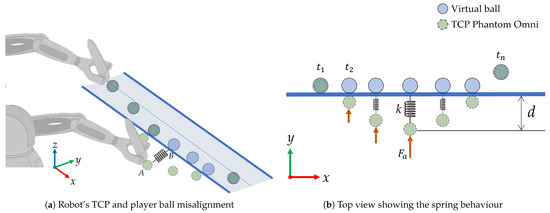 When the user moves the robot’s TCP outside the path (Figure 8a), the system applies haptic feedback that tries to align the robot’s TCP (point A) with the player ball (point B), similar to spring behaviour. Figure 8b details the haptic effect. Note that the player ball cannot go through the path boundaries, and the collision point (ball boundary) is detected automatically. The attraction force exerted by the Phantom Omni towards the collision point increases as the user moves the robot’s TCP away from the path. Thus, the haptic effect increases proportionally to the distance d between the position of the robot’s TCP and the position of the player ball, with an impedance k value adjustable in the game setup scene.