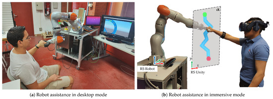 The IIWA robot is also compatible with the Robot Operating System (ROS), allowing for reading information about the robot’s status. Thus, in order to establish communication between the robot and the Unity environment, the Unity scene integrates the ROS-TCP-Connector package for sending/receiving messages from the ROS. The game scene contains a subscriber to a topic with the robot’s pose that updates the position of the player ball based on the received data. It should be noted that, unlike the Phantom Omni, the received position corresponds to the robot’s coordinate system, which does not match the Unity reference system (see Figure 9b). Therefore, it was necessary to implement a transformation method to adapt the position received from the robot to the virtual workspace in the Unity environment. Note that for this evaluation mode, the virtual path can be displayed in desktop mode or using a VR headset for a fully immersive experience.