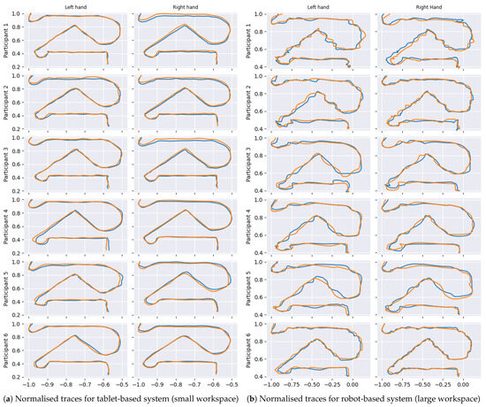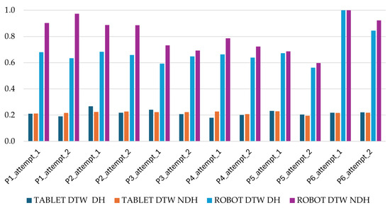 Furthermore, this paper presents a method for trajectory comparison using the DTW algorithm, showing that it is possible to detect differences between right- and left-handed participants or dominant versus non-dominant hands. The poorer performance, marked by higher DTW values for traces developed with the non-dominant hand, suggests that this multimodal system is feasible for measuring motor skills. Furthermore, the DTW values also show that performance in drawing tasks involving large movements is different. Figure 11 shows that higher DTW values were obtained for the robot-based system, clearly distinguishing between fine and gross motor performances. These results agree with the findings of Bondi et al. [54], who investigated the relationship between fine and gross motor coordination tasks through a network analysis linking graphomotor tasks (using tablet PC tracing), gross coordination (using items from the Körperkoordinationstest für Kinder), and strength (measured by handgrip) in school children. Their results suggest that specific parameters of tracing tasks, as well as other graphomotor tasks, should be taken into account when evaluating developmental trajectories and dysfunctions.