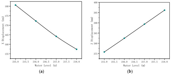 Influence of water level variation on displacement. (a) Horizontal direction (X direction), (b) vertical direction (Z direction).