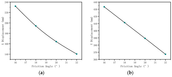 Influence of friction angle variation on displacement. (a) Horizontal direction (X direction), (b) vertical direction (Z direction).