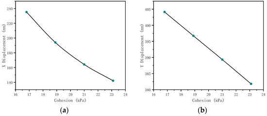 The relationship between displacement and cohesion is illustrated in Figure 6. From the simulation results, it can be observed that cohesion also significantly influences both the X and Z displacements of the surrounding rock of the tunnel. As the cohesion increases, both the X and Z displacements exhibit an approximately linear decrease. When the cohesion increases from 16.8 kPa to 23.1 kPa, the X displacement of the surrounding rock of the tunnel decreases from 238 mm to 138 mm, and the Z displacement decreases from 433 mm to 364 mm.