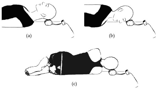 Strength assessment positions: (a) supine position for neck extensors assessment; (b) prone position for neck flexors assessment; (c) side decubitus for neck lateral flexors assessment.