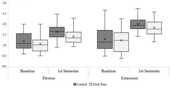 Both groups had similar neck strength at the baseline. At the end of the first semester, the neck pain group had less right lateral flexion strength than the asymptomatic group [t(42) = 2.83; p = 0.034]. The cervical strength in flexion [t(42) = 2.11; p = 0.165], extension [t(42) = 1.77; p = 0.302], and left lateral flexion [t(42) = 2.36; p = 0.101] remained similar between groups. In a within analysis, both groups increased their strength levels throughout the semester for all movements. Neck flexion [F(1, 42) = 39.1; p < 0.001; η2p = 0.482] increased in the CG [mean difference (MD) = 0.417; standard error (SE) = 0.093; t(42) = 4.48; p < 0.001] and NP groups [MD = 0.388; SE = 0.089; t(42) = 4.37; p < 0.001]. Extension [F(1, 42) = 69.0; p < 0.001; η2p = 0.622] increased in the CG [MD = 0.670; SE = 0.113; t(42) = 5.91; p < 0.001] and NP groups [MD = 0.633; SE = 0.108; t(42) = 5.84; p < 0.001]. Right lateral flexion [F(1, 42) = 31.1; p < 0.001; η2p = 0.432] increased in the CG [MD = 0.310; SE = 0.069; t(42) = 4.52; p < 0.001] and NP groups [MD = 0.225; SE = 0.067; t(42) = 3.36; p = 0.009]. Left lateral flexion [F(1, 42) = 31.9; p < 0.001; η2p = 0.438] increased in the CG [MD = 0.296; SE = 0.075; t(42) = 3.97; p < 0.002] and NP groups [MD = 0.292; SE = 0.073; t(42) = 4.02; p = 0.001]. Figure 2 and Figure 3 graphically depict these results, illustrating the comparative strength changes in each group for all movements.