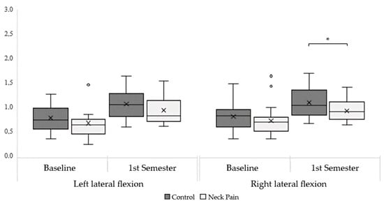 Knowing that the disrupted balance between agonists and antagonists of the different cervical movements can lead to cervical insufficiency, which has been identified as a causing or contributing factor in the pathogenesis of head and neck pain [41,54,60], the analysis of the evolving dynamics of these ratios is essential. In our study, dental students without pain exhibited an increased flexion/extension ratio at baseline (0.92) and a similar ratio of left and right lateral flexors (0.97) compared to the established normative values for their respective age group [49], which indicated an increased influence of neck flexors in this agonist/antagonist ratio. Compared with these students, the group with neck pain had marginal lower flexion/extension ratios at baseline and a sign of imbalance in left and right lateral flexors (0.93), which should have an equivalent strength represented by a ratio closer to 1. After 15 weeks, at the end of the semester, the flexion/extension ratio of both groups decreased, which could be related to their initial exposure to clinical practice and consequent solicitation of neck extensors, enhancing their role in the agonist–antagonist relationship between neck flexors and extensors in students from both groups. For the lateral flexors, we observed a different pattern, with the ratio increasing and representing an approximation of the neck strength in both sides, representing the tendency of lateral flexors to reach equivalent strength when exposed to clinical training, hence a ratio closer to 1. However, we expect this tendency to end and the imbalance to rise again as the students with neck pain accumulate more clinical practice hours. This assumption is based on the observation that sustained cervical rotation leads to increased activity in the contralateral flexor muscles [61]. This phenomenon is often associated with pain, which in turn is linked to deficits in neck strength and abnormal muscle activation patterns [62]. Such patterns are likely to contribute to the anticipated agonist/antagonist imbalance, a correlation that is further supported by previous findings of enhanced co-activation in antagonist muscles among patients with neck pain [54,60].
