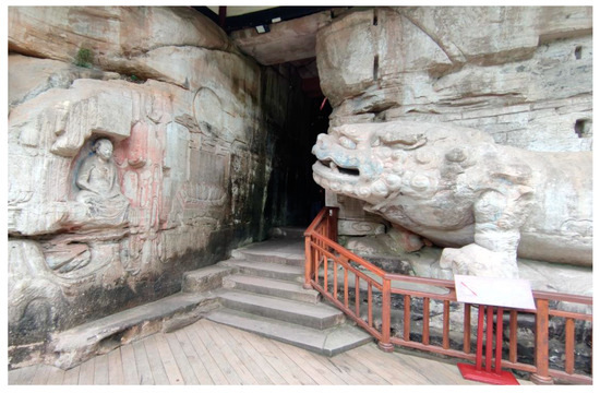 Grottos, as significant repositories of Buddhist cultural studies, have garnered substantial scholarly interest within the academic community [1,2]. A substantial corpus of the sculptural and pictorial representations within grottos serves as a testament to the evolution of religious culture and the progressive development of human social ideologies. These artifacts, embodying high artistic and scientific significance, provide invaluable insights into the historical and cultural narratives of the era. The Yuanjue Grottos were founded in 1174 AD, and are an example of the famous grottos in southwest China (Figure 1). The Yuanjue Grottos have good structural stability due to their scientific design and construction, which effectively solves their drainage and lighting problems. The sculptures in the Yuanjue Grottos are perfectly integrated with the landscape, and are considered an invaluable culture treasure.