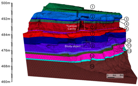 The surrounding rock of the Yuanjue Cave can be subdivided, from top to bottom, into the following 14 layers: (1) artificial fill stratum, (2) fine sandstone, (3) thin-bedded fine sandstone, (4) fine sandstone, (5) interbedded fine sandstone, (6) fine sandstone, (7) pebbled fine sandstone, (8) fine sandstone, (9) mudstone, (10) fine sandstone, (11) mudstone, (12) fine sandstone, (13) mudstone, and (14) interbedded fine sandstone and mudstone [7,19,20]. A comprehensive 3D geological model of the Yuanjue Grottos combined with the 3D point cloud data of the Yuanjue Grottos, with their joints and fissures, was constructed using software such as Autodesk ReCap 2021, Geomagic studio 2015, Rhino 7, and FLAC3D 6.0 (Figure 3).
