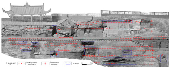 The weathering cavities are mainly distributed in the five layers of soft rock in the surrounding rock of the Yuanjue Grottos (Figure 3 and Figure 4), including the third layer of fine sandstone, the fifth layer of thin-layer fine sandstone, the seventh layer of pebbled fine sandstone, the eighth layer fine sandstone, and the ninth layer of mudstone. The width of the maximum cavity in the third layer of fine sandstone is 6.5 m, and the maximum depth is 1.6 m. The width of the maximum cavity in the fifth layer of fine sandstone is 2.3 m, and the maximum depth is 1.2 m. The width of the maximum cavity in the seventh layer of fine sandstone is 4.2 m, and the maximum depth is 12 m. The width of the maximum cavity in the ninth layer of fine sandstone is 2.7 m and the maximum depth is 3.1 m, which has been filled and repaired with stone strips. A certain scale cavity has also developed in the eleventh layer of the mudstone, with a maximum cavity width of 7.2 m and a maximum depth of 3.8 m, which has been filled and repaired with stone strips.