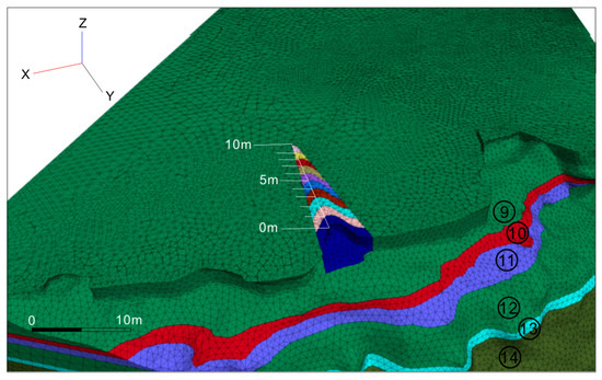 Strata distribution model of the surrounding rocks. ① artificial fill stratum, ② fine sandstone, ③ thin-bedded fine sandstone, ④ fine sandstone, ⑤ interbedded fine sandstone, ⑥ fine sandstone, ⑦ pebbled fine sandstone, ⑧ fine sandstone, ⑨ mudstone, ⑩ fine sandstone, ⑪ mudstone, ⑫ fine sandstone, ⑬ mudstone, and ⑭ interbedded fine sandstone and mudstone