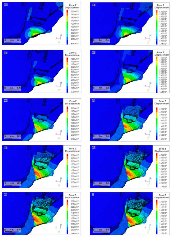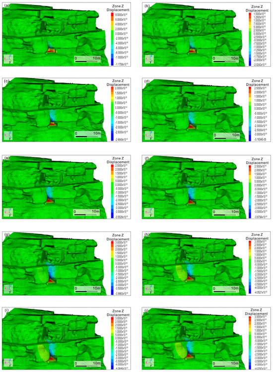 Vertical displacement nephograms of wallrock of the Yuanjue Grottos under different cavity depths. (a–j) denote cavity depths of 0–10 m, respectively.