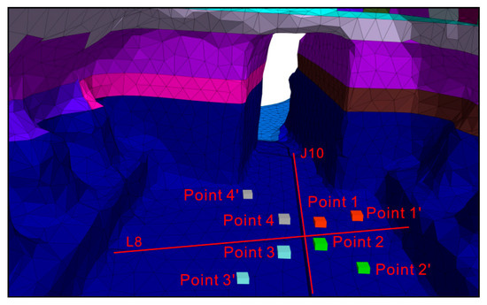 As mentioned above, the influence of the weathering cavity on the Yuanjue Grottos is controlled by the fissures [19,20]. Therefore, displacement monitoring stations were set up at the intersection of the fissures in order to further ascertain the influence degree of the weathering cave on the Yuanjue Grottos, where the aim was to explore the deformation regularity of the baseplate of the Yuanjue Grottos. There were two fissures in the bottom of the Yuanjue Grottos, named Fissures J10 and L8, which are almost vertically crossed (Figure 8). The baseplate of the Yuanjue Grottos is divided into four areas, and two displacement monitoring points were selected in each area. This was performed to analyze the vertical displacement of each area that occurred due to the change in cavity depth, and the curve of vertical displacement change with the depth of cavity was drawn (Figure 9).