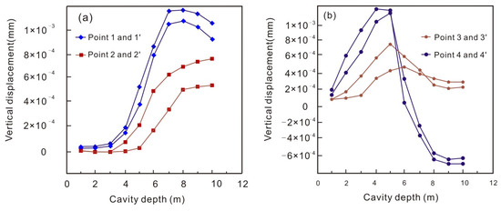 The evolution processes of the vertical displacement of Points 1 and 2 can be subdivided into three stages. Stage 1 represents when the cavity depth is less than 4 m, where vertical displacement changes slowly. Stage 2 represents when the cavity depth is between 4 m and 7 m, where the vertical displacement of Points 1 and 2 has entered an accelerated change stage along with increases in the cavity depth. Stage 3 represents when the cavity depth is more than 7 m, where the vertical displacement of Points 1 and 2 tends to gently change along with increases in the cavity depth. Stages 1 and 2 belong to the elastic deformation stage, while Stage 3 indicates where the rock strata of the baseplate transform into the plastic and brittle deformation stage [22].
