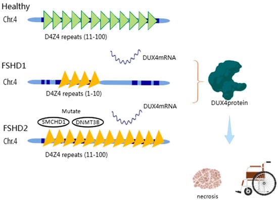 The genetic mechanisms that contribute to the onset of FSHD are extremely complicated, but they are characterized in common by the misexpression of the DUX4 gene in skeletal muscle, which consequently causes the muscle disease. Patients are classified as FSHD1 and FSHD2 based on different genetic mechanisms; approximately 95% of patients are categorized as FSHD 1. In patients with FSHD1 (Figure 1), it is caused by contraction of a distal array of microsatellite repeats on chromosome 4q35; in normal individuals, these regions usually consist of 11-100 3.3 kb-sized D4Z4 repetitive units containing two exons and a double homeobox protein 4 protein 4 (DUX4) gene throughout the open reading frame (ORF), which is typically hypermethylated in healthy individuals, while the D4Z4 repeats shrinks to 10 or fewer units and methylation is disrupted in FSHD1 [4]. FSHD2, about 5% of the FSHD, shrinkage of the D4Z4 array is not the primary factor; the reduction of this array does not even occur (Figure 1). The pathogenic causes of FSHD2 are more related to gene mutations encoding D4Z4 array methylation proteins; for example, most FSHD2 patients carry mutations in SMCHD1, which mainly encodes proteins that inhibit chromatin structure, and mutations in DNMT3B, which encodes DNA methyltransferase [5,6], resulting in hypomethylation of D4Z4 sequences. Both FSHD1 and FSHD2 cause chromatin relaxation and misexpression of the DUX4 in skeletal muscle [7,8] (Figure 1), ultimately leading to degenerative necrosis of skeletal muscle fibers.