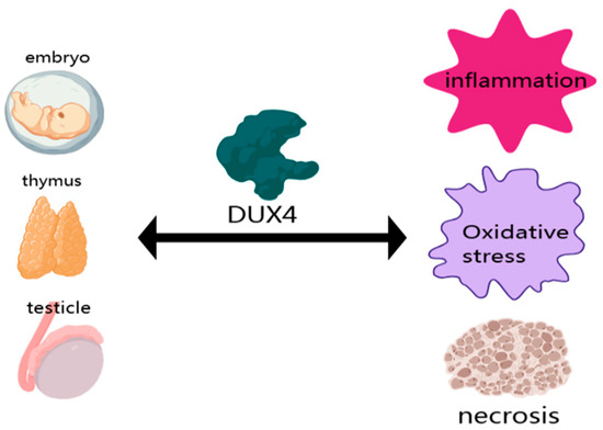 Figure 2. DUX4 plays a role at both physiological and pathological levels. DUX4 plays a physiological role during early embryonic development and is expressed in the thymus and male testes in adulthood. However, aberrant expression of DUX4 in skeletal muscle can trigger a series of pathological responses, such as muscle atrophy, inflammation, apoptosis, and impaired muscle function.