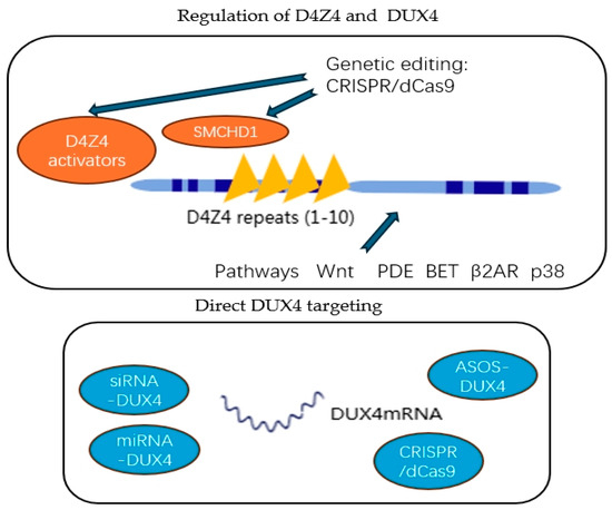 67. Himeda, C.L.; Jones, T.I.; Jones, P.L. CRISPR/dCas9-mediated Transcriptional Inhibition Ameliorates the Epigenetic Dysregulation at D4Z4 and Represses DUX4-fl in FSH Muscular Dystrophy. Mol. Ther. 2016, 24, 527–535. [Google Scholar] [CrossRef]
