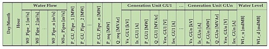 The SCADA system collects the water flows in the pipes that supply the turbines (WF_Pipe_1,…, WF_Pipe_n, and WFtot_Pipes), in [m3], the active powers produced by the generation units (GUs), which are supplied through Pipe_1, …, Pipe_n (P_GU_Pipe_1, …, P_GU_Pipe_n), the requested active and reactive power of the system to the hydropower plant (P_req and Q_req), in [MW] and [MVAr]. It also contains information about the various technical parameters of the generation units, such as the active and reactive powers (P_GU1, …, P_GUn, and Q_GU1, …, Q_GUn), in [MW] and [MVAr], the stator voltage and current (Vs_GU1, …, Vs_GUn and Is_GU1, …, Is_GUn), in [kV] and [kA], the excitation voltage or current (Vex_GU1, …, Vex_GUn and Iex_GU1,…, Iex_GUn), in [V] and [A], water levels of the reservoir upstream and downstream (WLr_u and WLr_d), in [mdMB]. Appendix A includes in Table A1, as an example, the above information for a day. All variables are recorded in a table with the time details in the format month–day–hour for each year, as seen in Figure 6.