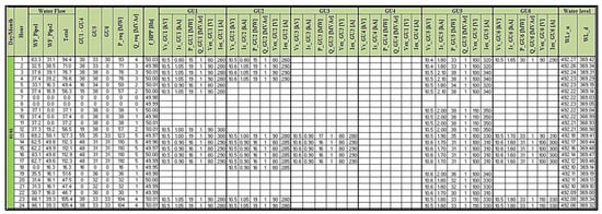 The SCADA database includes fields completed at every hour with the following technical parameters: the individual water flows of each pipe, the total water flow of the two pipes, the total produced power of the first four-generation units (GU1–GU4), the produced power by the GU5, the produced power by the GU6, the total produced active and reactive power by the plant, the frequency, the stator voltage, the stator current, the produced active and reactive powers, the excitation voltage, the excitation current of each generation unit, and water levels of the reservoir (upstream and downstream).