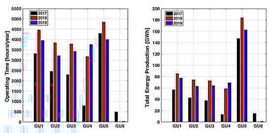 The DEMA can see after data processing the summary information on the operation of the plant regarding the number of hours and the total energy produced by each generation unit (GU1–GU2), see Figure 9.