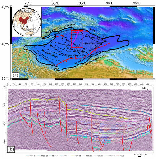 (a) The location of the Tarim Basin and its subdivisions. The location of the research area is marked by a red rectangle. The location of the seismic section is marked by a pink line. (b) The seismic section in the north-central Tarim Basin. This seismic section shows that the deep structure in Tarim is very complicated and controlled by faults.