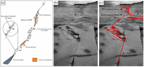 Geological structure of a strike-slip fault33. (a) Structural zones of strike-slip faults, including the principal displacement zone (PDZ), restraining band, and horsetail splay. The zone or plane of dip-slip or strike-slip accounts for the greatest proportion of accumulated strain. Subsidiary structures such as synthetic and antithetic faults and folds (e.g., fault splays, back thrusts, fracture zones, and en echelon folds) will be kinematically linked to the PDZ. (b) Outcrop of strike-slip fault. (c) Strike-slip fault interpretation (red lines) based on the outcrop. The strike-slip displacement in the fault zone causes various structural deformations in the surrounding area.