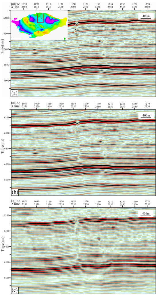 Quality improvement of the seismic data. (a) The original seismic profile. The burial depth map of the Tarim Ordovician strata is in the upper left corner, and the red line shows the location of the seismic section. The green arrow indicates the north direction. (b) The seismic profile after PCA+ structure-oriented filtering. This methodology involves calculating and analyzing the covariance matrix of seismic traces within a defined time window, facilitating a robust denoising process and improving the overall quality of seismic data for further analysis and interpretation. (c) The seismic profile of PCA+ structure-oriented filtering + fault-focused imaging. By maintaining the essential characteristics of the original seismic signal while improving its signal-to-noise ratio, this method effectively emphasizes the discontinuity along the in-phase axis.