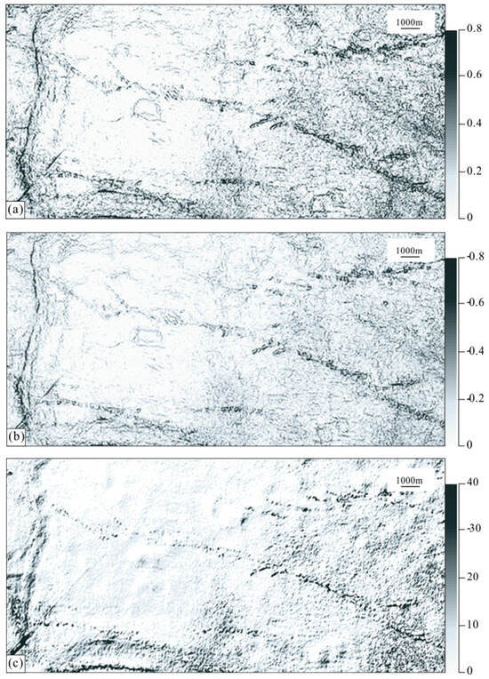 Attributes of seismic curvature. The data points of the strike-slip faults are relatively clear, but there is little difference between them and the data points in the non-fault areas; that is, the boundary between the faults and non-faults is not clear. (a) Map of the maximum positive curvature attribute. The largest positive curvature in the normal curvature is called the maximum positive curvature. This curvature can amplify fault information and some small linear structures in the plane. (b) Map of the minimum negative curvature attribute. (c) Map of the dip attribute. The dip attribute reflects the change in the dip angle, and it is effective in depicting the dominant section with a large fault distance.