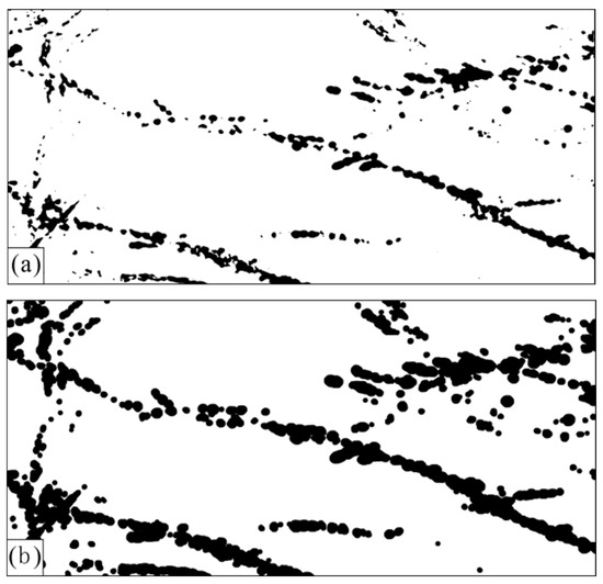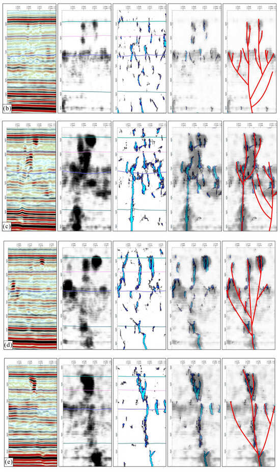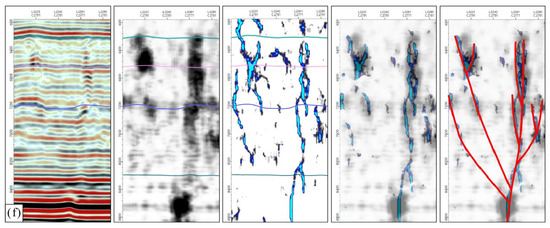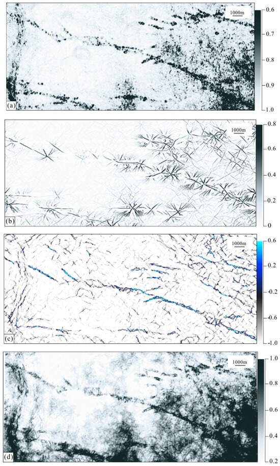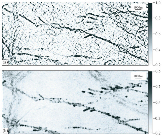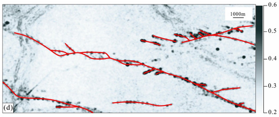 According to the identification results of the strike-slip faults of the cratonic basin with low-frequency energy attributes and high-frequency attenuation attributes, most areas are significantly disturbed by “non-fault” areas, and a small number of branch faults can be shown, but they are not as obvious (Figure 4b,c).