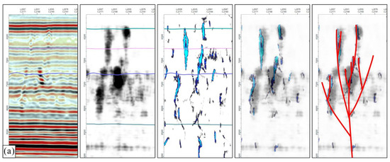 Faults are often mixed with other geological sequence features and structural features that can cause seismic amplitude changes (Figure 6a). Especially when the signal-to-noise ratio of the seismic dataset is low or the geological structure is complex, the fault or other discontinuity features shown by the coherence attribute are generally effective in horizontal sections or stratigraphic sections but difficult to identify and interpret in vertical sections.