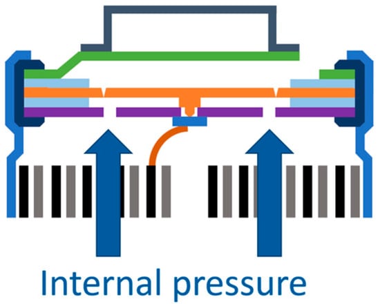 The CID consists of two components, (i) the top disk (orange components in Figure 1) and (ii) the bottom disk (dark blue components in Figure 1). The top disk is a flexible, ring-shaped conductor connected to the bottom disk by a weld in the center of the top disk. Both disks are separated from each other by insulation. Thus, the welded connection between the top and bottom disk is the only electrical connection to the active material, i.e., this represents a weak point in the current path. The top disk is connected to the jelly roll (gray component in Figure 1) by a bottom disk. The light blue areas are plastic insulation, and at the top is the plus pole for external connection to a load or power supply [6].