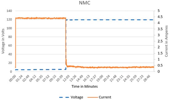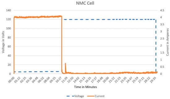 The FreedomCar overcharge test defines that the current should be set at 32 A [8] for EV tests. However, if the tests are performed at less than pack level, the current must be scaled down [8]. Therefore, for this test series, the current level (refer to Table 3) for each type of cell was selected according to the manufacturer cell datasheet. For the NCA and the NMC cell, the current was set to 4 A. This was limited by the maximum current of the Gwinstek PSW 800-4.32 power supply. Both cells can handle potentially higher continuous currents. In the case of the maximum continuous charge, the current was 1.5 A, according to the datasheet. The cell was charged until the CID interrupted the charge flow or the test was terminated. Each test in the series was carried out for 30 min, regardless of how the cell performed, i.e., irrespective of whether the cell had a thermal runaway or not.