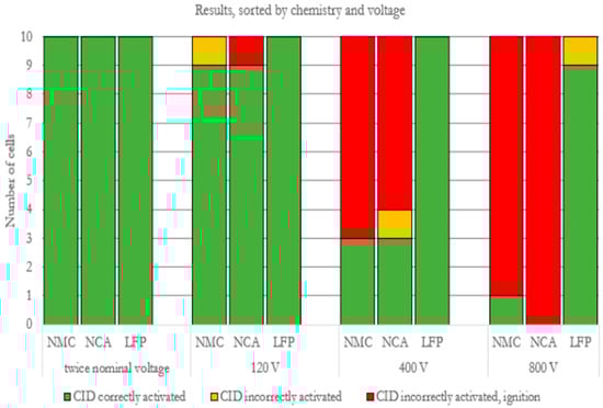 According to the battery test standards by FreedomCAR, it is difficult to push cells to their safety limits, i.e., independent of the type of cell chemistry. If the overcharging is performed at twice the nominal voltage, the cell is not being pushed to the extreme limits, and there will be no dangerous behavior. In such a voltage range (2–5 V), the CID correctly detaches the plus and minus poles without igniting the cell. However, the test standards do not demonstrate the reality of the areas in which lithium cells are used. It must be noted that in the energy storage market, there are increasingly higher interconnected series switching systems with voltages of up to 800 V. Considering the results of the first test series up to 120 V, it can be seen that the first critical cell behavior occurs with NMC and NCA chemistries, while the LFP chemistry is safe in comparison and there are no ignitions or fires of hazard level 5 [21] or higher. During the 400 V test, it is noticed that the critical cases for the NMC and NCA chemistries have doubled compared to the 120 V (see Figure 9), but the LFP cell can still be considered uncritical. For the 800 V tests, NMC and NCA cells performed almost the same, i.e., ignition stage, while the LFP cells had the first case of critical behavior when compared with the 120 V and 400 V test series (see Figure 9).