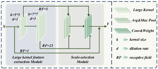 Among them, the large kernel feature extraction module consists of a convolution kernel of size 5 × 5, and a dilated convolution kernel of size 7 × 7 with a dilation rate of 3, which is the same as the LSKNet. Concatenate convolutions with different dilation rates can minimize the number of parameters while maximizing the receptive field of the convolutional kernel. Among them, the receptive field of the first-layer convolution is 5, and according to Equation (1), the receptive field of the second-layer convolution can be further calculated to be 23. In Equation (1), represents the size of the i-th convolutional kernel, represents the receptive field, and represents the dilation rate of the i-th convolutional kernel.