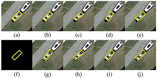 Visualization of pseudo labels. (a) Original image (with background). (f) Original label (black background). (b,d,g,i) Add counterclockwise random angles based on the original labels. (c,e,h,j) Add clockwise random angles based on the original labels. (b–e) Extend the length based on the original label. (g–j) Shorten the length based on the original label. (b,c,g,h) Widen the width based on the original label. (d,e,i,j) Narrow the width based on the original label.